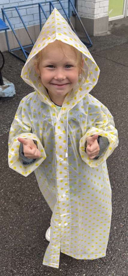 П’ятирічна Кіра Смоляр в дощовику на кнопках іде з дитячого садочка